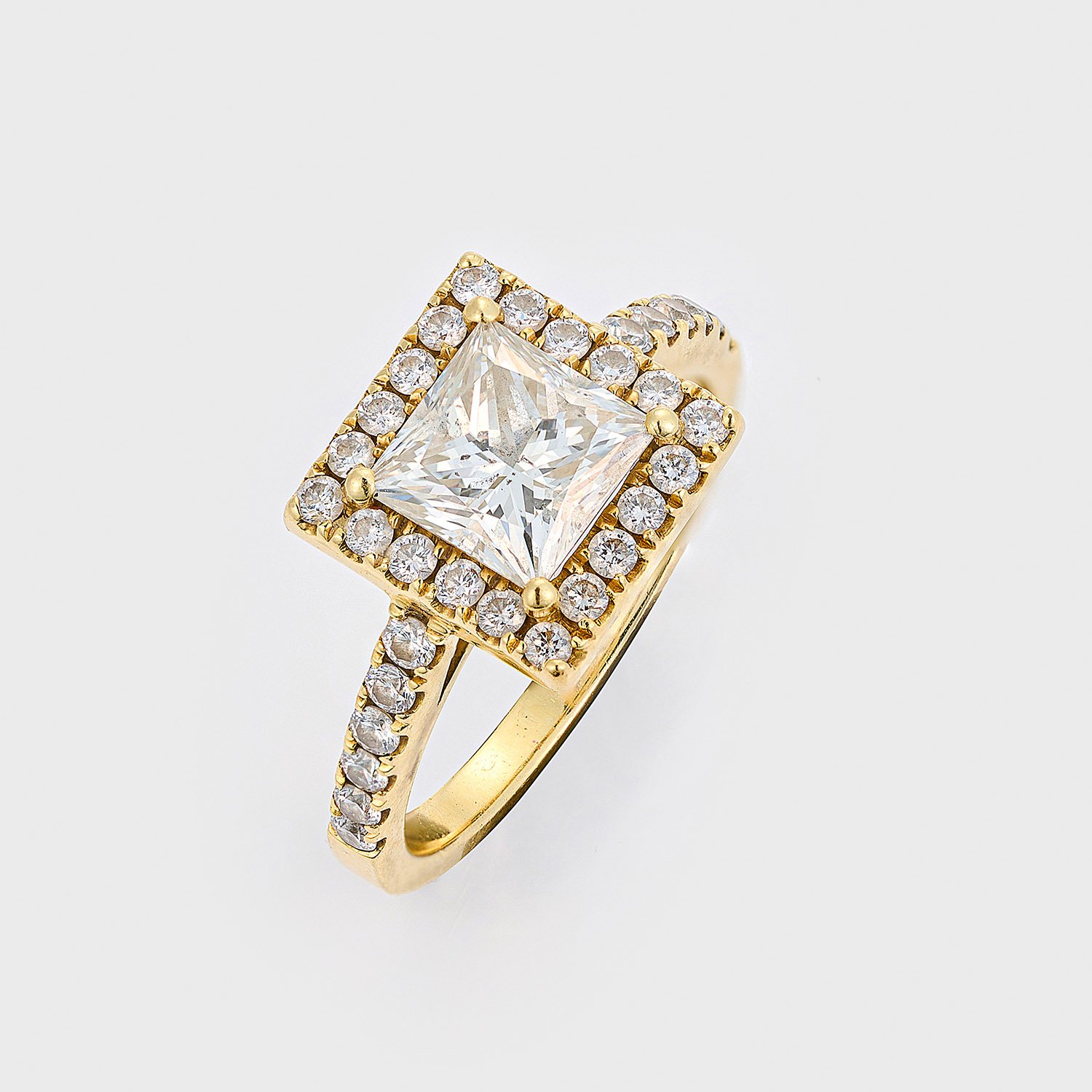 Gelbgold, gest. 750. Zentral besetzt mit einem Diamanten von ca. 1,76 ct. (I/si2) im Square Modified Brilliant Cut, entouriert von Brillanten von zus. ca. 0,48 ct.; Gew. ca. 5,34 g.