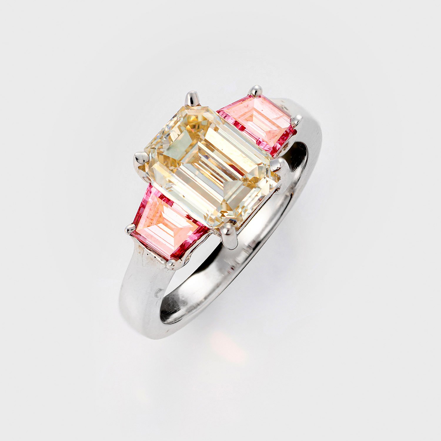 Weißgold, 750. Zentral besetzt mit einem Diamanten von ca. 2,90 ct. (K-L/vs) im Emerald-Variationcut, flankiert von Fancy pinkfarbenen Diamantbaguetten von zus. ca. 1,10 ct. (vs-si). Gew. ca. 6,50 g.
