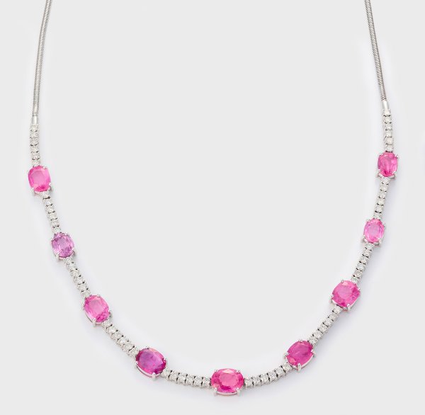 Necklace set with pink sapphires approx. 11,44 ct. and diamonds approx. 2,10 ct., in 18 k white gold. Certificate included.