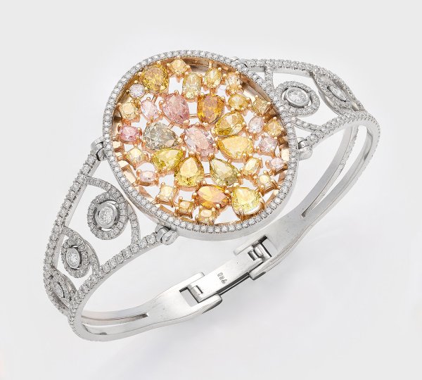Weißgold, gest. 750. Natural Fancy-Diamanten in den Farben Greenish Yellow, Canarian Yellow, Orange Yellow, Brownish Yellow und Pink von zus. ca. 3,97 ct. in unterschiedlichen Schliffarten, ausgefasst mit weißen Brillanten von zus. 2,37 ct. (G-H/vs-si). Gew. ca. 35,16 g.