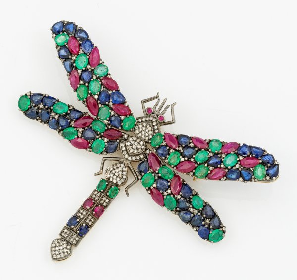 Dragonfly brooch set with diamonds approx. 1,40 ct., sapphires, rubies and emeralds approx. 35 ct., in 14 k gold and silver.