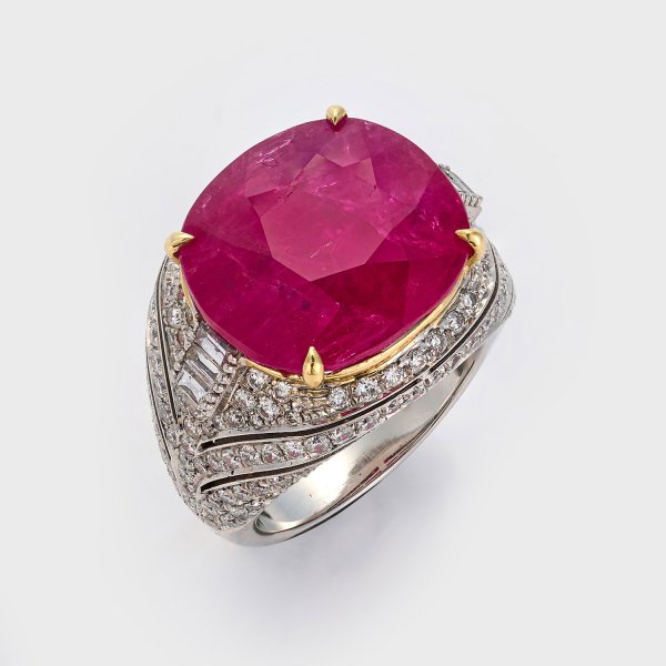 Weißgold, gest. 750. Zentral besetzt mit einem taubenblutroten Rubin von ca. 22,16 ct., ausgefasst mit Diamanten von zus. ca. 3,00 ct.; Gew. ca. 18,24 g.