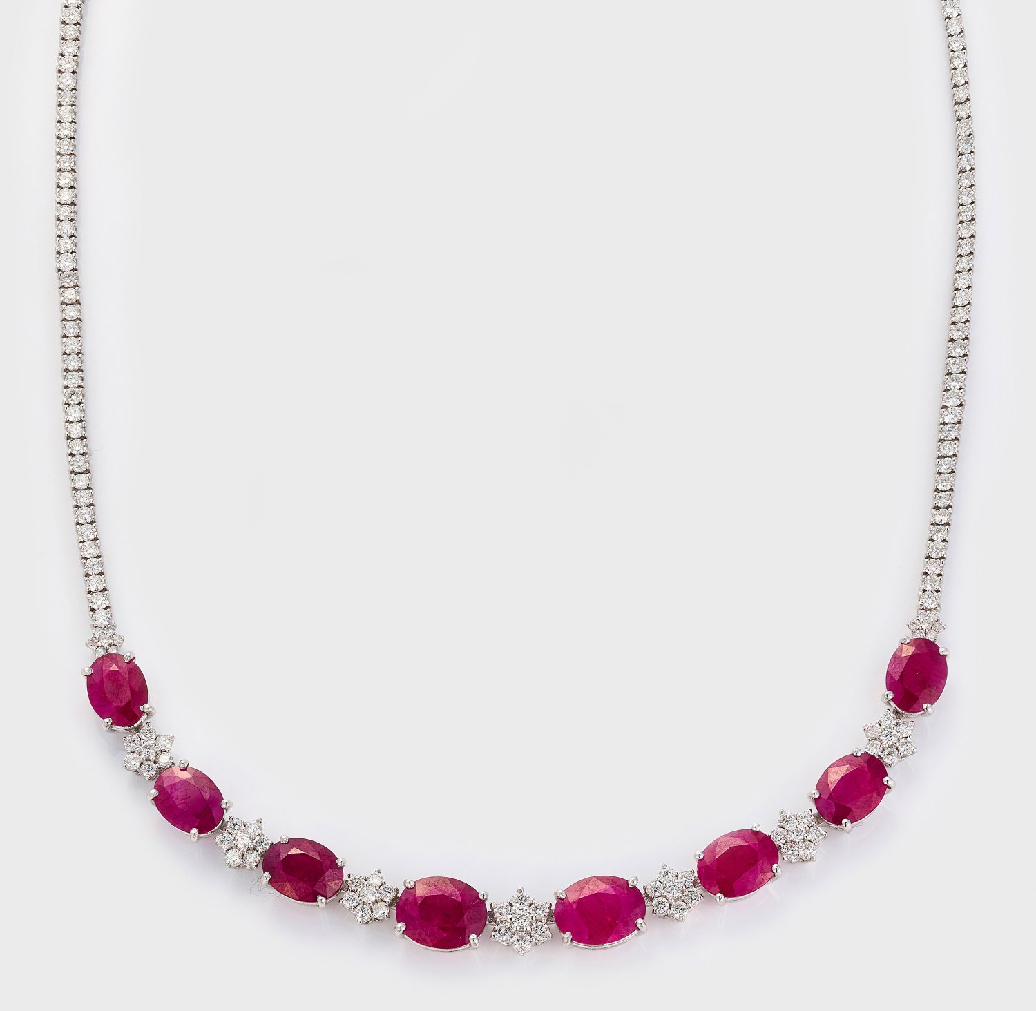 Necklace set with pigeon blood red rubies approx. 20,49 ct. (standard heat minor) and diamonds approx. 6,05 ct., in 18 k white gold. Certificates included.