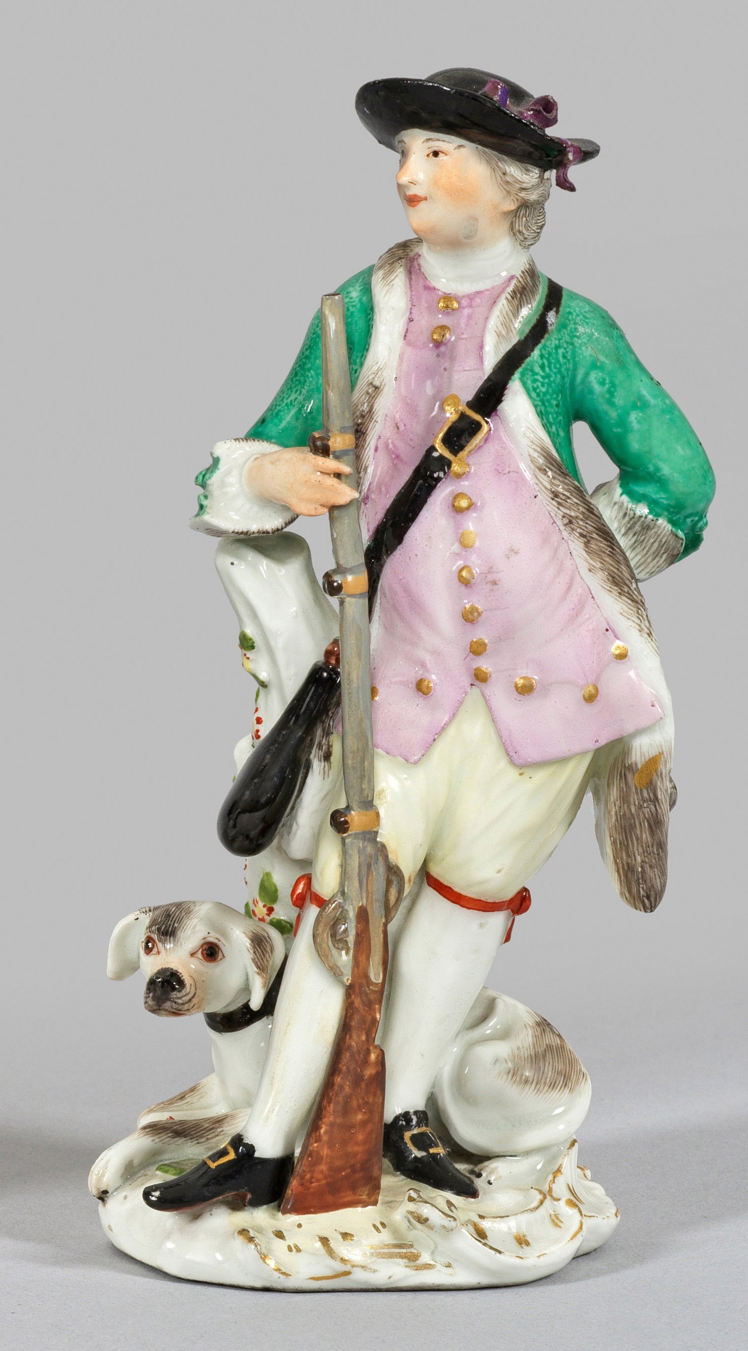 Auf einem mit plastischen Blüten und Blättern belegten Sockel stehender Jäger in zartgelber Hose mit pelzgefütterter, grüner Jacke über fliederfarbener Weste sowie einem schwarzen Hut. Mit der rechten Hand ein am Boden stehendes Jagdgewehr haltend. Die Linke hat er auf den Rücken gelegt. Zu seinen Füßen liegender Vorstehhund. Polychrome Malerei mit wenig Gold. Entw. Johann Joachim Kaendler oder Johann Friedrich Eberlein. Unw. rest./best.; H. 15,5 cm.