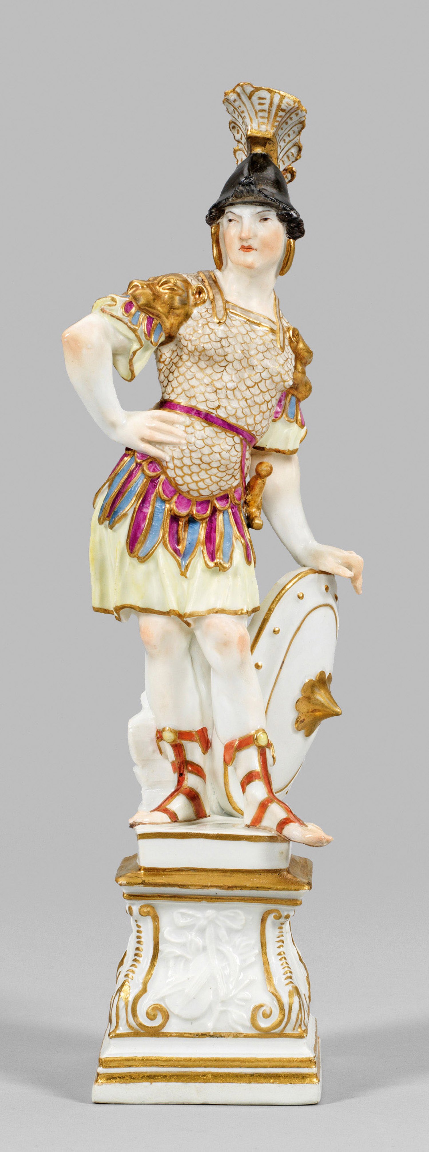Hoher, quadratischer, volutenförmig gerahmter Sockel mit Profilkanten, zu vier Seiten umzogen mit reliefierten, von Lorbeerzweigen und Schleifen gerahmten Musikinstrumenten. Über flacher Plinthe im Kontrapost stehender Soldat von kräftiger Statur in stolzer, majestätischer Haltung mit einem scharfen, abwendenden Blick. Sich mit der linken Hand auf einen am Boden abgesetzten, goldverzierten Schild (Scutum) mit rückseitigen, bronzefarbenen Haltegriffen lehnend. Die Rechte hat er in die Hüfte gestützt. Bekleidet ist er mit einer römischen Rüstung aus Harnisch mit goldenem Schuppenmosaik und Löwen-Epauletten als Schulterdopplung. Zur linken Seite hat er den Gladius gegürtet und ist damit als Offizier erkennbar. Das Haupt bedeckt mit einem dunklen Helm aus augusteischer Zeit, bekrönt von einem weißen, goldornamentierten Federbusch. An den Füßen trägt er geschnürte Sandalen in Eisenrot mit Edelsteindekor. Polychrome Malerei mit reicher Goldstaffage. Entw. Johann Joachim Kaendler. Unw. rest.; Schwertermarke. H. 30 cm.