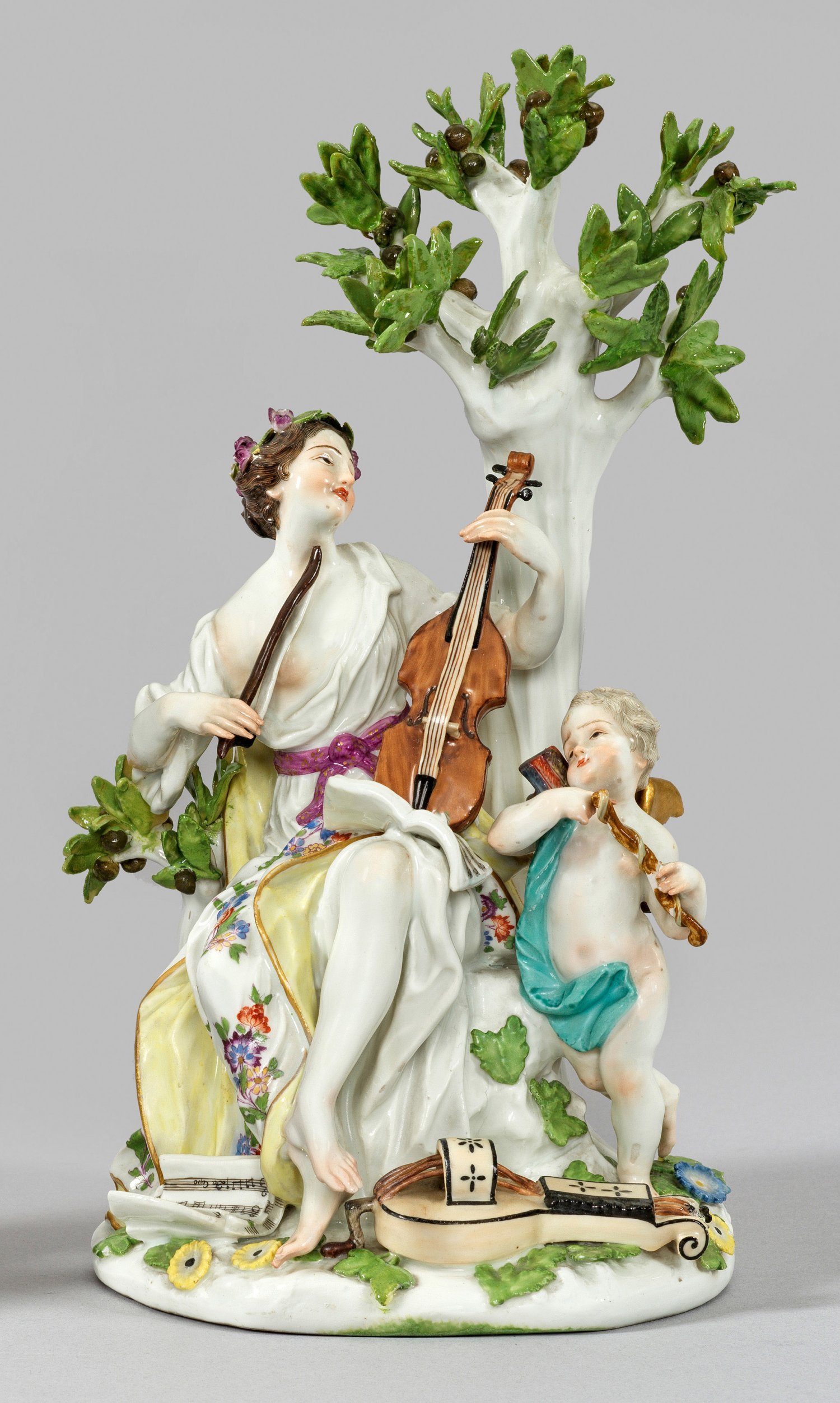 aus dem Zyklus "Apollo und die neun Musen". Ovaler, mit plastischen Blüten und Blättern belegter Sockel. Nahe eines belaubten Baumes, auf einer Felsbank sitzende Erato, die Muse der Liebesdichtung, Lyrik und des Gesangs. In der linken Hand eine Viola, in der Rechten einen Bogen haltend. Zu ihren Füßen liegende Notenblätter und Drehleier. Seitlich stehende Amorette, auf dem Rücken den Köcher tragend. Polychrome Malerei mit Goldkonturierung. Entw. Johann Joachim Kaendler, 1744. Rücks. eingeritzt "Erato". Rest.; Schwertermarke. H. 27 cm.