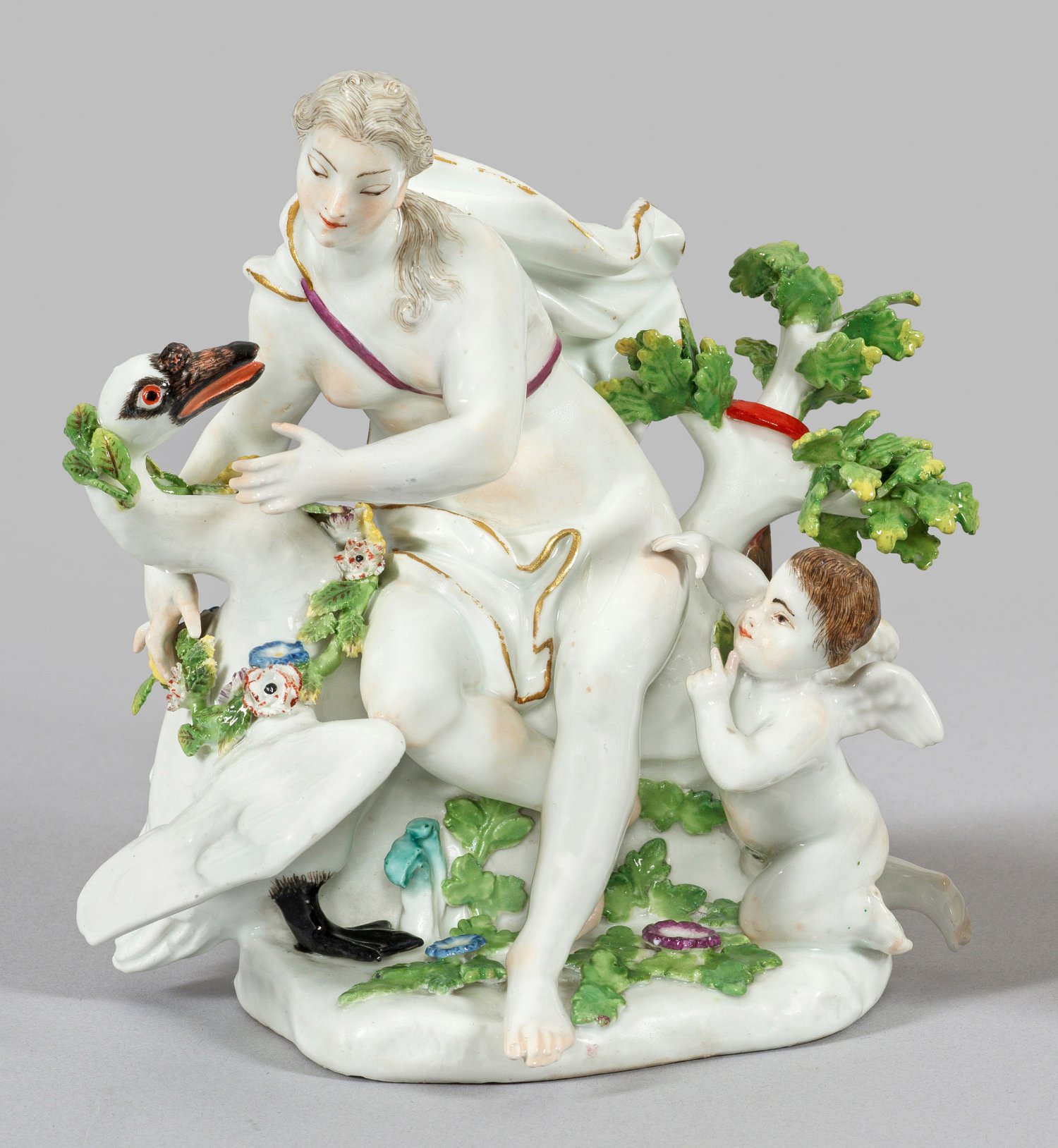 Über einem mit plastischen Blüten und Blättern belegtem Sockel, auf einem Felsen sitzende Leda, Geliebte des Zeus, den seitlich stehenden Schwan mit einer Blütengirlande schmückend. Zu ihren Füßen hockende Amorette. Polychrome Malerei mit Goldkonturierung. Entw. Johann Joachim Kaendler, 1745. Minim. best.; Rest.; Undeutl. Schwertermarke. H. 16 cm.