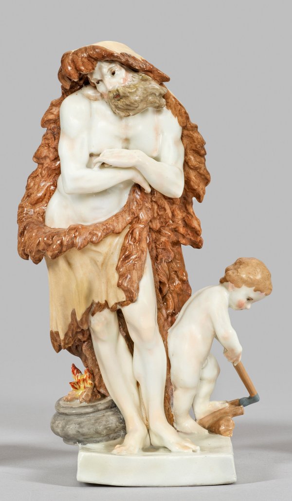 Auf einem Rechteckssockel neben einer kleinen Feuerschale stehender, bärtiger Mann mit verschränkten Armen, einen pelzgefütterten Mantel tragend. Zu seiner Seite Holz hackender Putto. Polychrome Malerei. Entw. Johann Joachim Kaendler, 1745. Rest.; Schwertermarke. H. 25 cm.