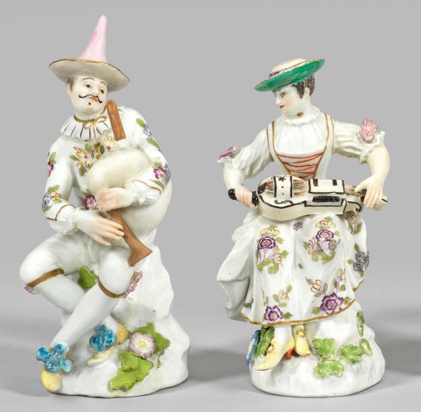 Auf felsiger Anhöhe sitzender, junger Harlekin mit Dudelsack. Als Gegenstück junge Tirolerin (bzw. Columbine) in sommerlicher Tracht, eine Drehleier spielend. Polychrome Malerei mit Goldkonturierung. Entw. Johann Joachim Kaendler. Rest.; Schwertermarken. H. 12,5 - 14 cm.