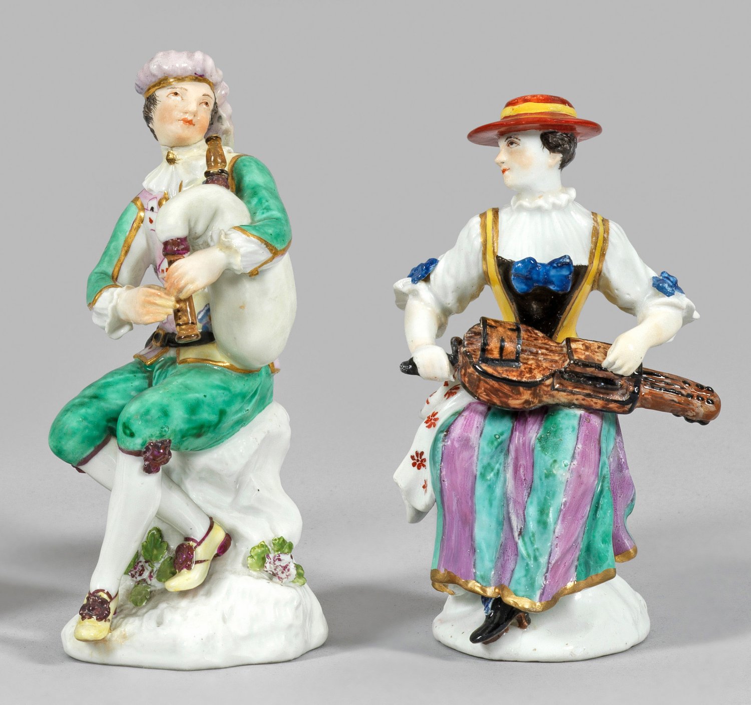 Auf felsiger Anhöhe sitzender, junger Harlekin mit Dudelsack. Als Gegenstück junge Tirolerin (bzw. Columbine) in sommerlicher Tracht, eine Drehleier spielend. Polychrome Malerei mit Goldkonturierung. Entw. Johann Joachim Kaendler. Minim. rest.; H. 13 cm.