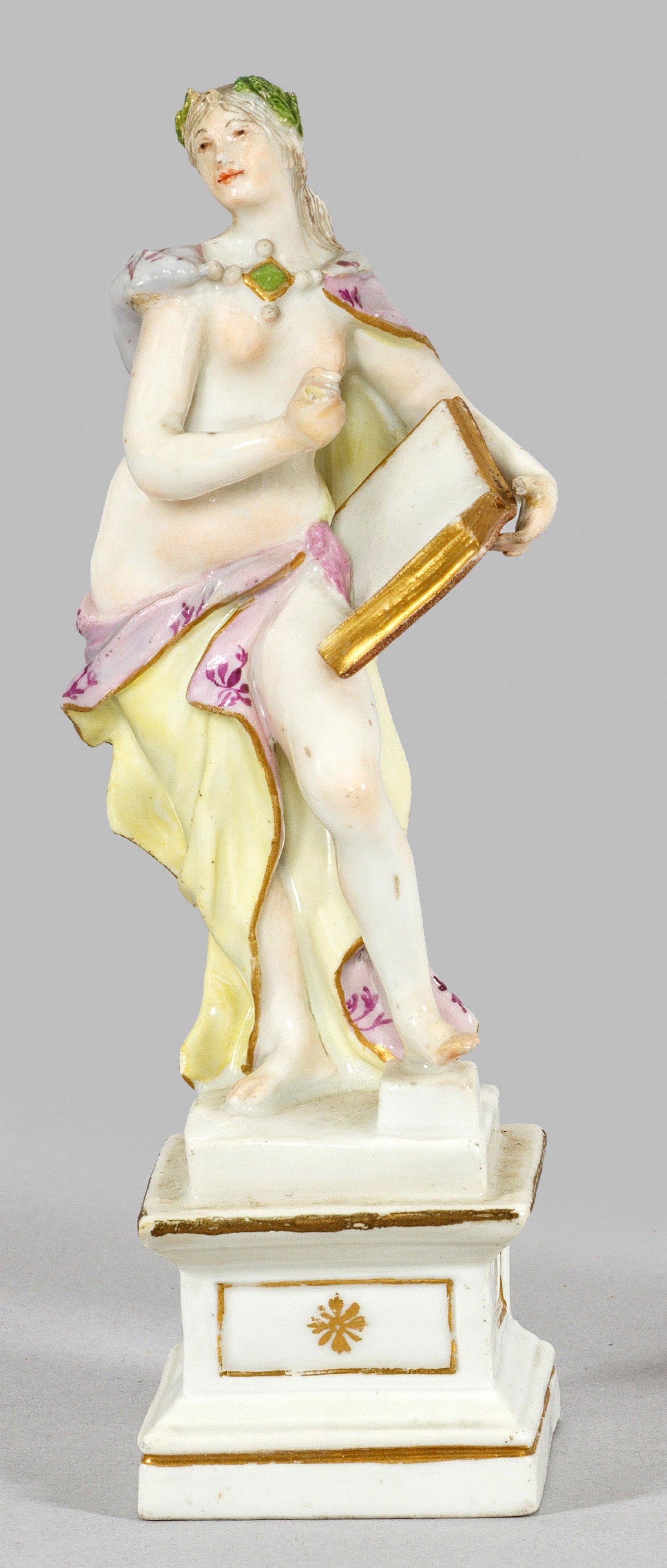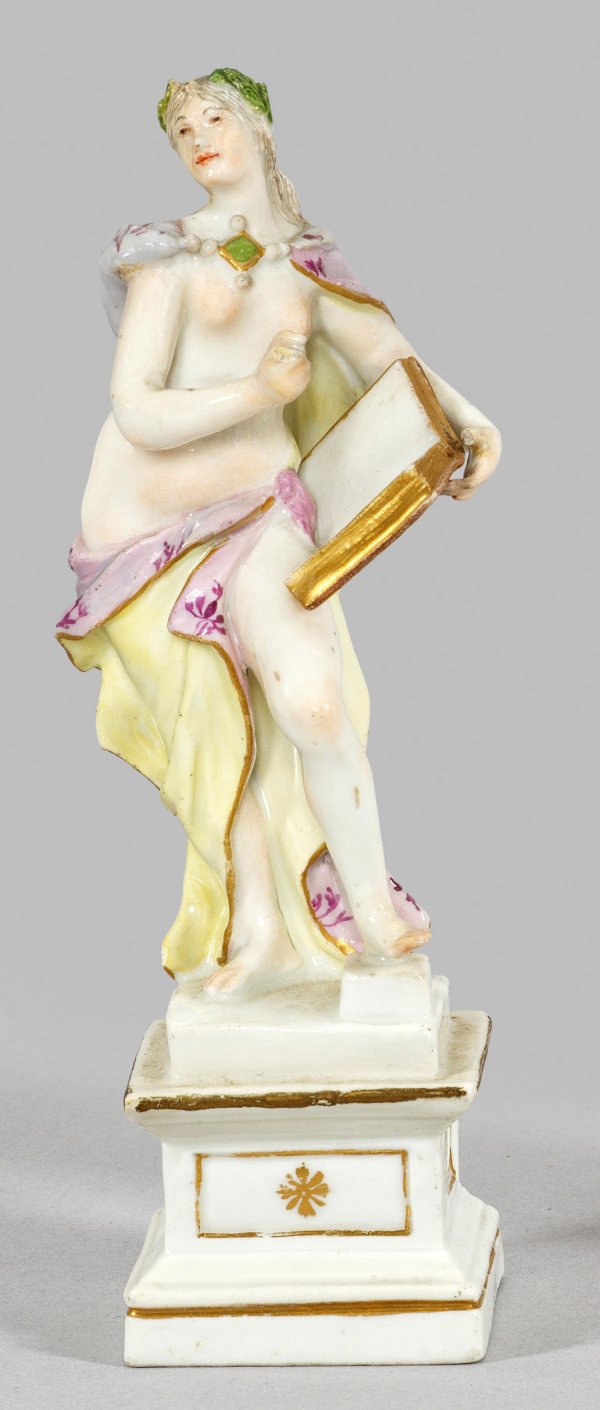 Auf quadratischem, profiliertem Postamentsockel stehende, lorbeerbekränzte Muse Klio in antikisierendem, blass violett und gelbem Gewand. Polychrome Malerei mit Goldstaffage. Entw. Friedrich Elias Meyer. Best./rest.; Schwertermarke. H. 13,5 cm.