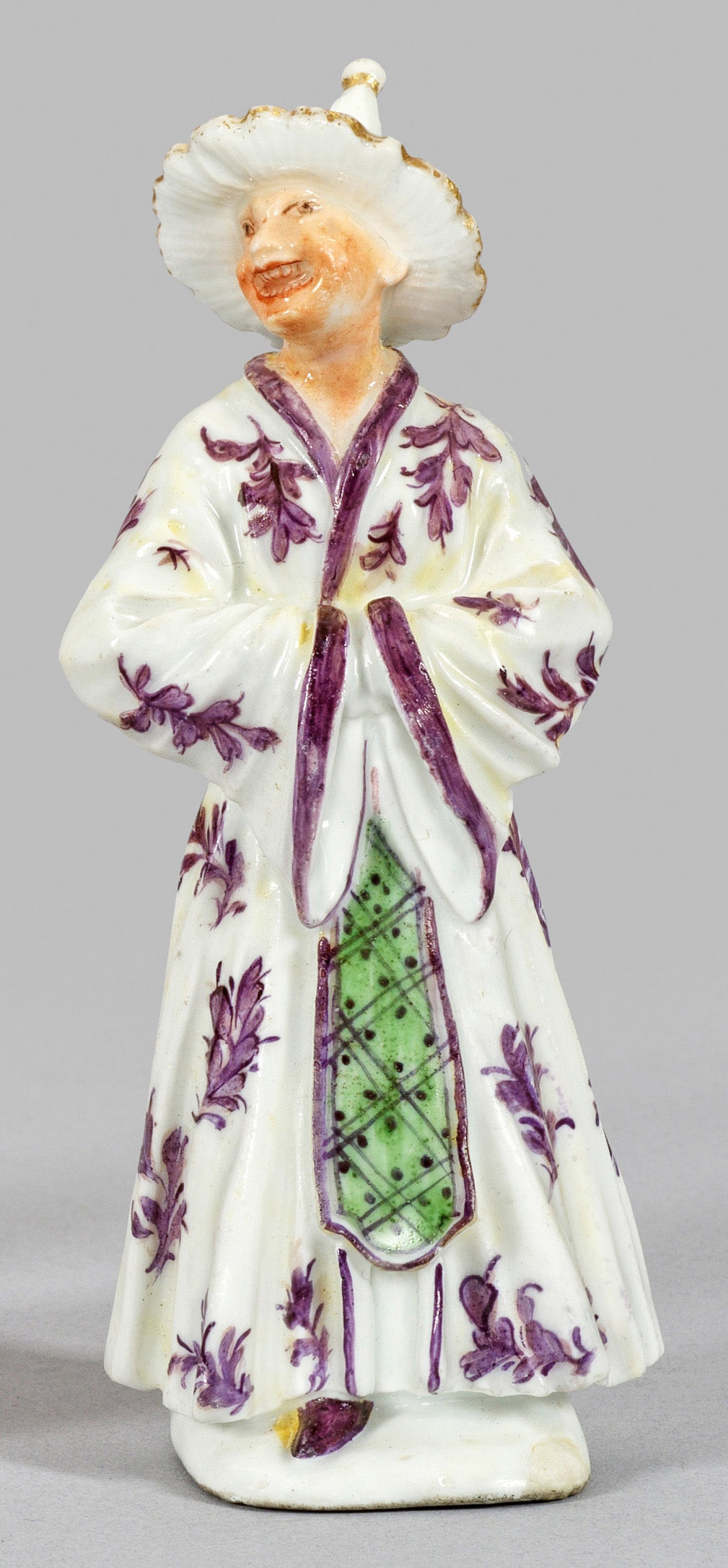 Auf flachem Sockel stehender, lachender Chinese mit geöffneten Mund und sichtbaren Zähnen, die Hände in den Ärmeln versteckt haltend. Gekleidet in ein bodenlanges, weißes, floral gemustertes Gewand. Der Kopf bedeckt von einem spitzen Strohhut. Polychrome Malerei mit wenig Gold. Entw. Peter Reinicke, um 1743. Unw. rest.; Schwertermarke. H. 12 cm.