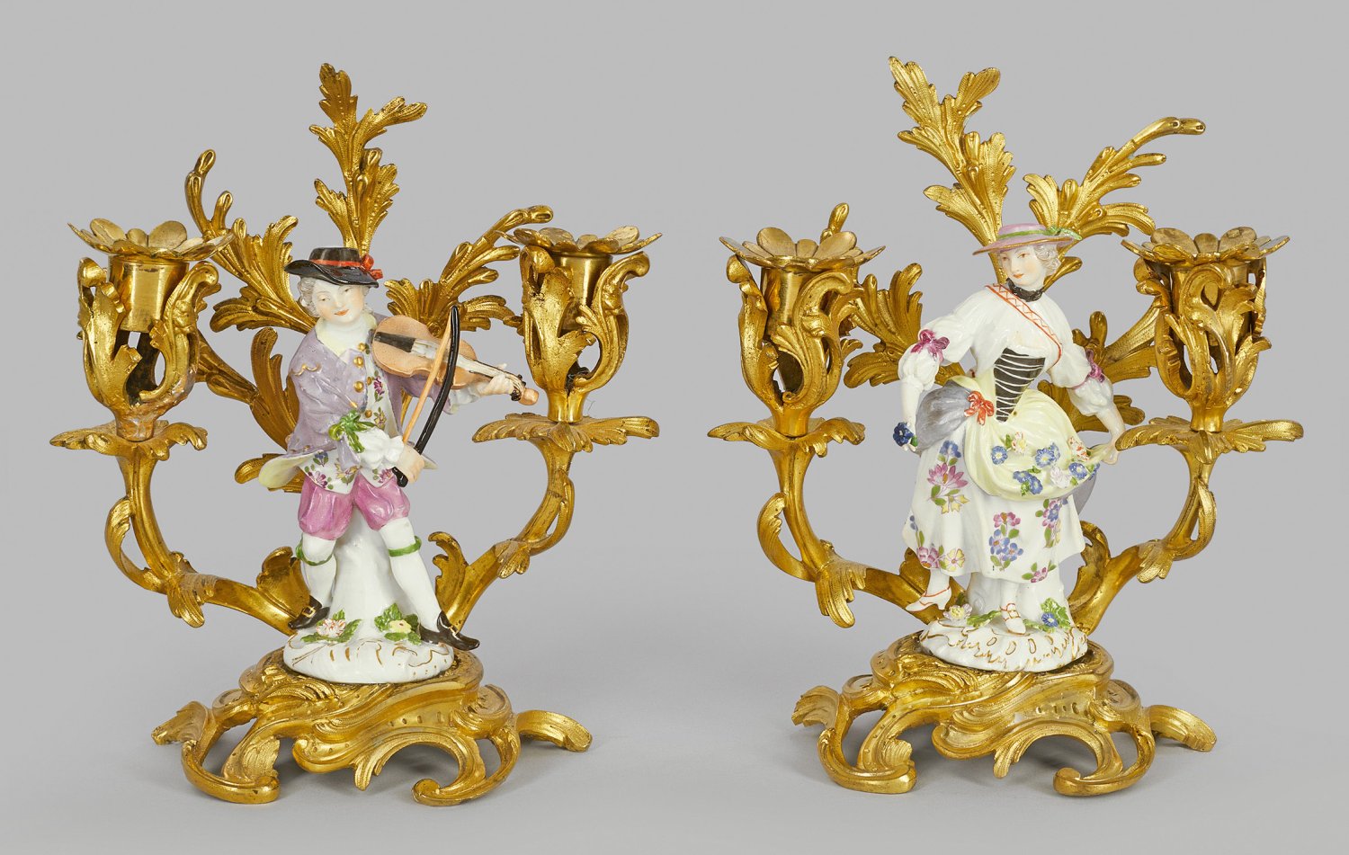 A pair of figural gilt-bronze mounted candlesticks with porcelain figures of a violin player and a dancing Tyrolean woman. Insignificantly restored/chipped.