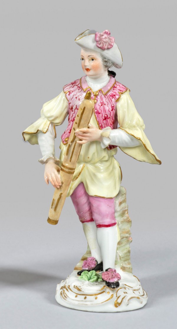 Auf rocaillereliefiertem Sockel stehender Musikant in sommerlicher Kleidung mit blüten- und schleifengeschmücktem Hut. Polychrome Malerei mit Goldstaffage. Entw. Friedrich Elias Meyer und Johann Joachim Kaendler. Rest.; Schwertermarke. H. 13,5 cm.