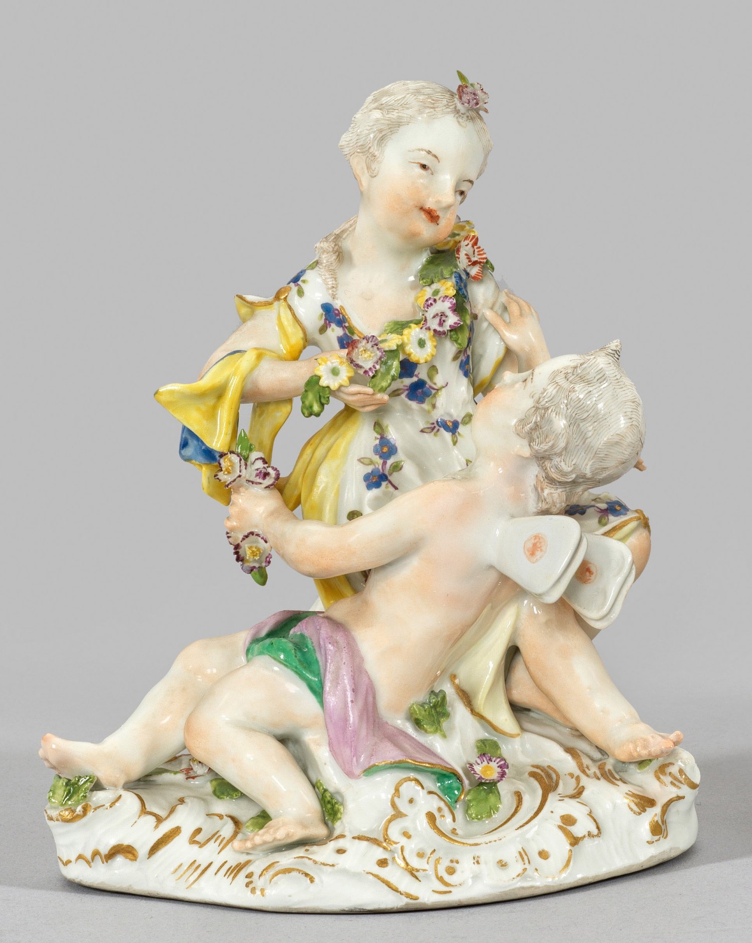 Auf unregelmäßigem, mit Blättern und Blüten belegtem Rocaillesockel auf einem Steinblock sitzende Amorette mit Blütenkranz als Flora, den quer auf ihrem Oberschenkel liegenden geflügelten Amor als Zephyr innig anblickend. Polychrome Malerei mit Goldstaffage. Entw. Johann Joachim Kaendler. Unw. rest.; Minim. best.; Schwertermarke. H. 13 cm.