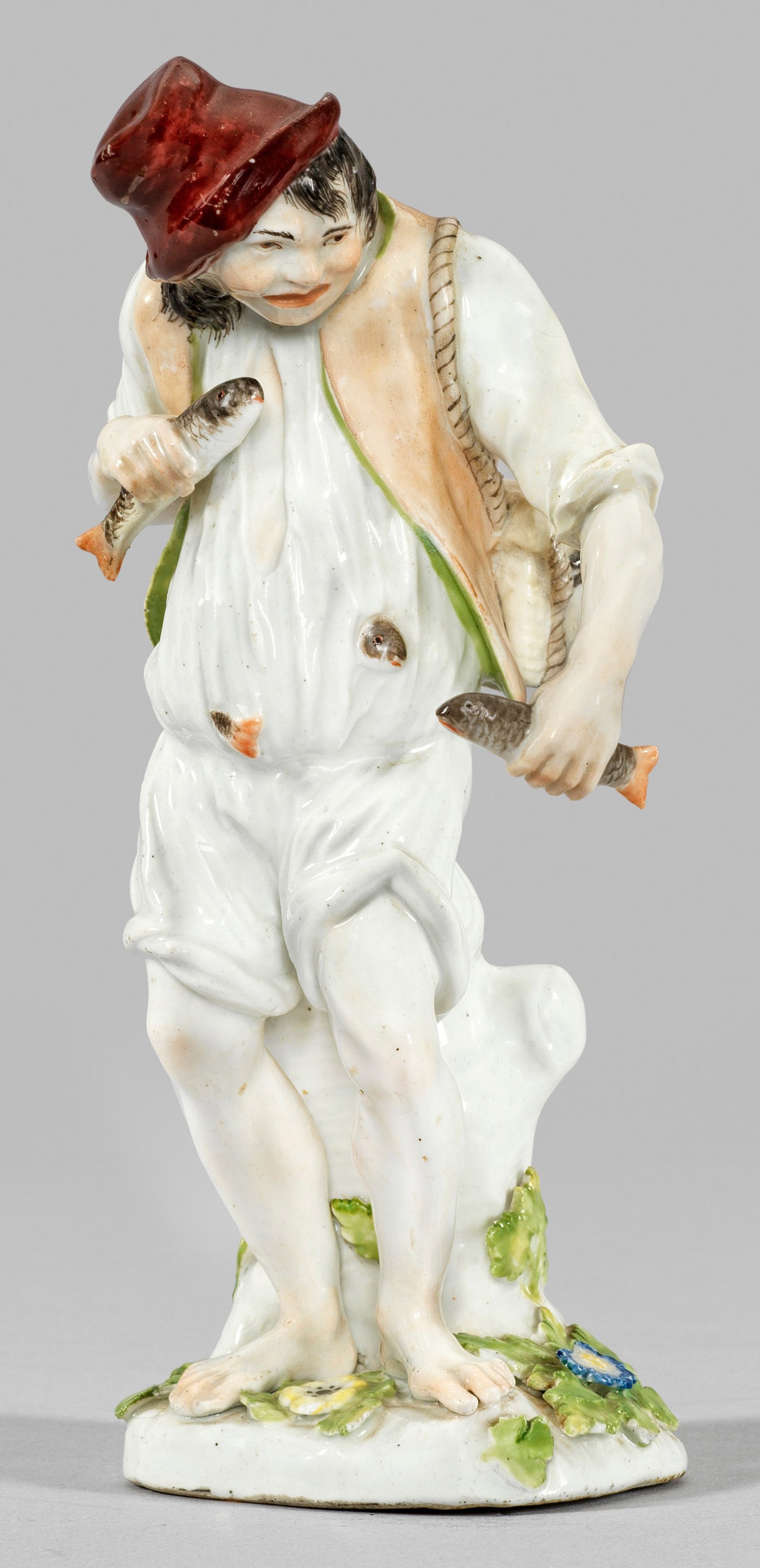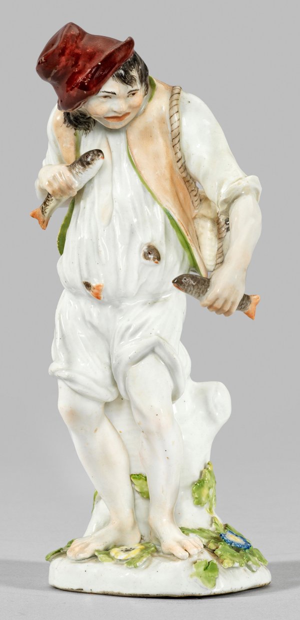 Auf einem rechteckig abgerundeten mit Blüten und Blättern belegtem Sockel stehender, leicht gebuckter Fischer mit zwei Fischen in der Hand. Entw. Johann Joachim Kaendler, 1738. Überarbeitet von Peter Reinicke, 1743. Polychrome Malerei. Die Rückenansicht inspiriert durch den Kupferstich "Aqua" nach Abraham Blomaert aus der Serie "Die vier Elemente". Rest.; Unw. best.; H. 17,5 cm.
