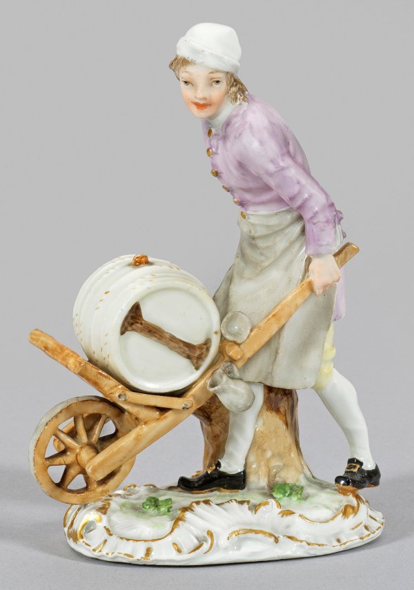 Auf rocaillereliefiertem Sockel stehender Ausrufer, eine Schubkarre mit einem Weinessigfass vor sich herschiebend. Polychrome Malerei mit Goldstaffage. Entw. Johann Joachim Kaendler und Peter Reinicke, nach 1753. Nach einer Vorlage von Christophe Huet. Pressziffer 30. Minim. rest.; Schwertermarke. H. 14 cm.