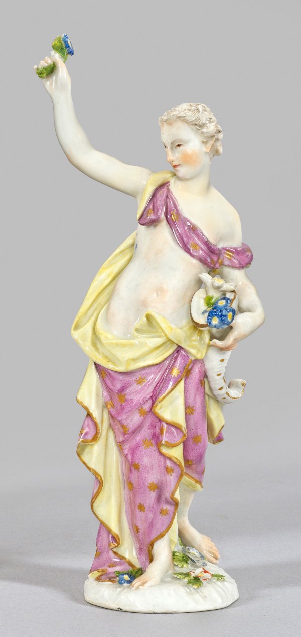 Naturalistischer, mit Blüten und Blättern belegter Sockel, mittig stehende, antikisierend gekleidete Göttin Flora mit purpurfarbenem, von Goldsternen gemustertem und gelb gefüttertem Gewand, unter ihrem rechten Arm ein Füllhorn mit plastischen Blüten haltend. Entw. wohl Friedrich Elias Meyer. Unw. rest.; Schwertermarke. H. 19,5 cm.