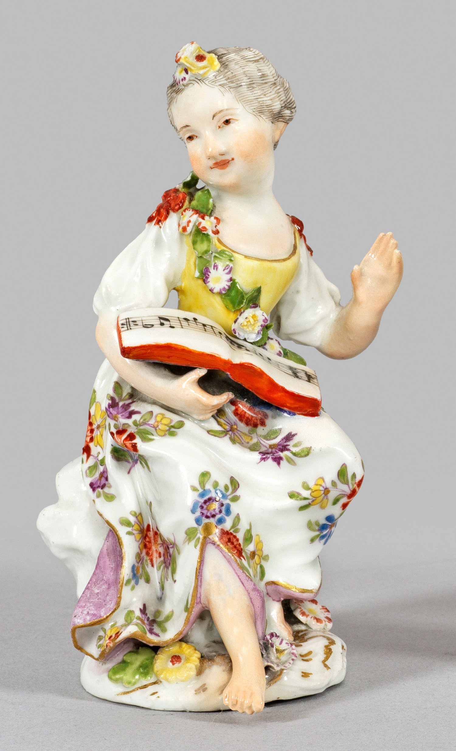 Auf rocaillereliefiertem Sockel an einen Felssockel gelehntes, halb sitzendes Mädchen mit Notenblatt, die linke Hand zum Anstimmen eines Liedes in Aufmerksamkeit erhoben. Polychrome Malerei mit Goldstaffage. Entw. Johann Joachim Kaendler. Minim. best./rest.; H. 12 cm.