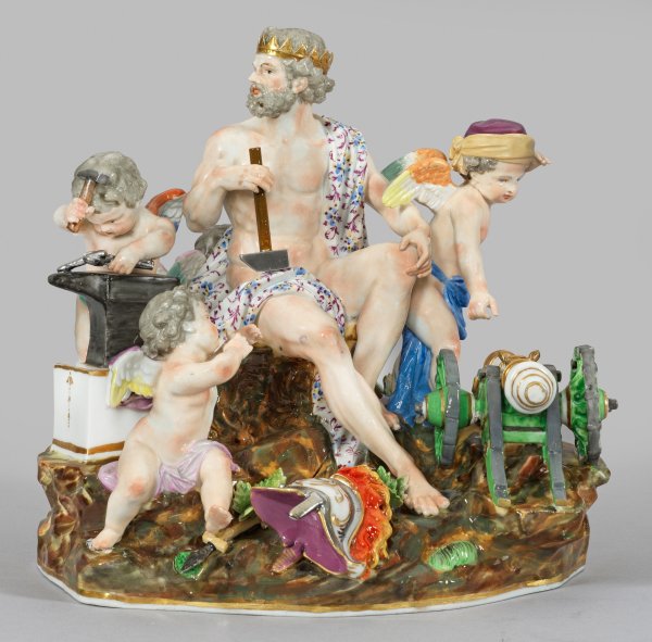 aus der Serie "Vier Elemente". Auf unregelmäßigem Felssockel erhöht sitzender Vulkanus mit Goldkrone, sich auf einen Hammer stützend. Umgeben von drei Putten beim Schmieden von Eisen, Stopfen des Kanonenrohrs. Zu seinen Füßen liegender, antikisierender Helm mit Helmbusch. Rückseitig ein weiterer sitzender Putto. Polychrome Malerei mit reicher Goldstaffage. Entw. Michel Victor Acier, 1777. Rest.; Malerei teilw. erg.; Schwertermarke. 24 cm.