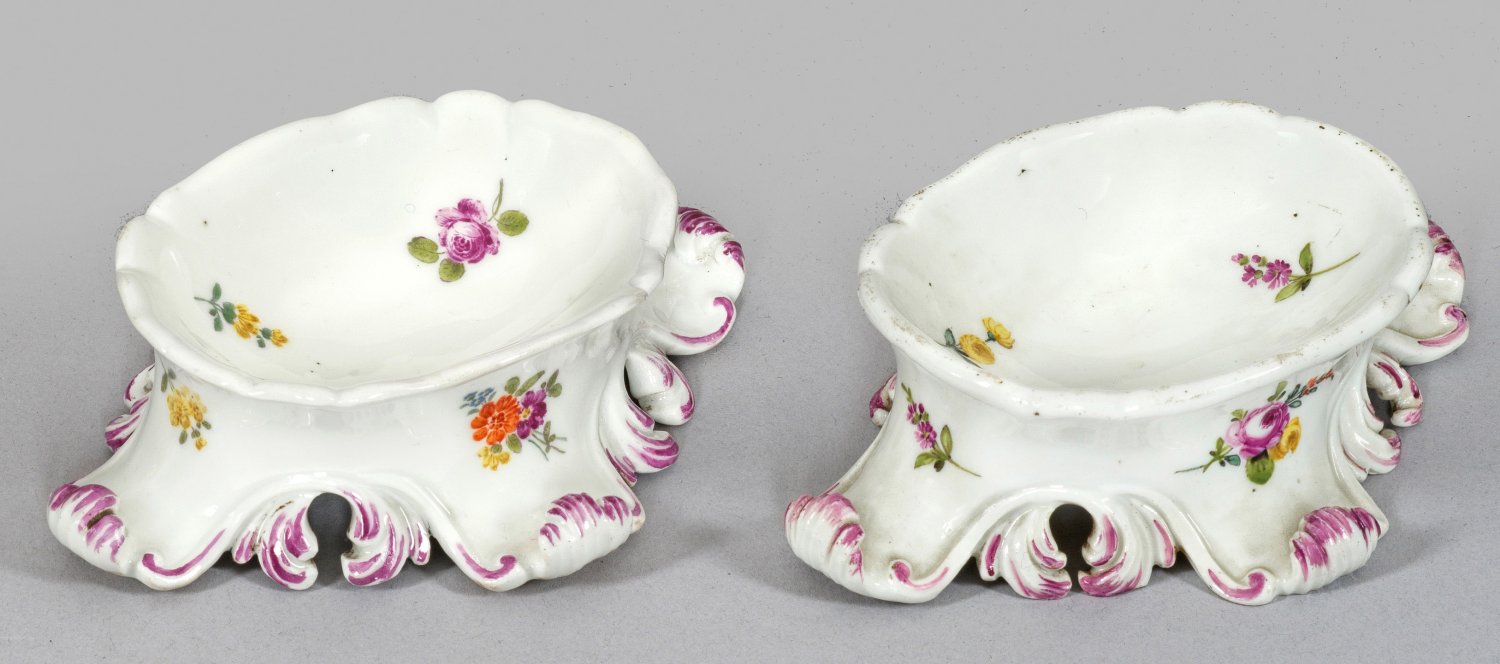 A pair of porcelain salt cellars with flower decor. Rubbed gold rim. Crossed swords mark.