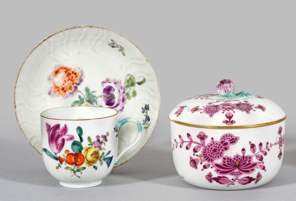 Oval gedrückter Korpus mit passig gewölbtem Deckel und Knospenknauf. Umlaufend der Wandung goldgehöhte, Indianische Malerei in Purpurcamaieu. Uber dem Rundstand ovale Tasse mit Asthenkel und kapuzinerbraunem Rand. Untertasse mit Reliefdekor "Altozier". Auf der Wandung bzw. im Spiegel Blumengebinde. Polychrome Malerei mit Goldstaffage. Unw. best.; Ber.; Untertasse erg.; Schwertermarke. H. 7 cm - 10 cm.