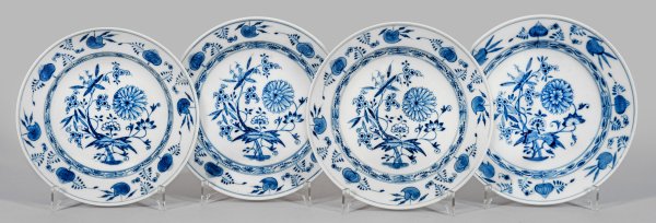 Runde, leicht gemuldete Form mit schräg ansteigender Fahne. Drei Speise- und ein Suppenteller. Zwiebelmusterdekor in unterglasurblauer Malerei nach ostasiatischem bzw. Meissener Vorbild. Überwiegend Blaumalerzeichen "W". Zeptermarke. D. 23 cm - 24 cm.