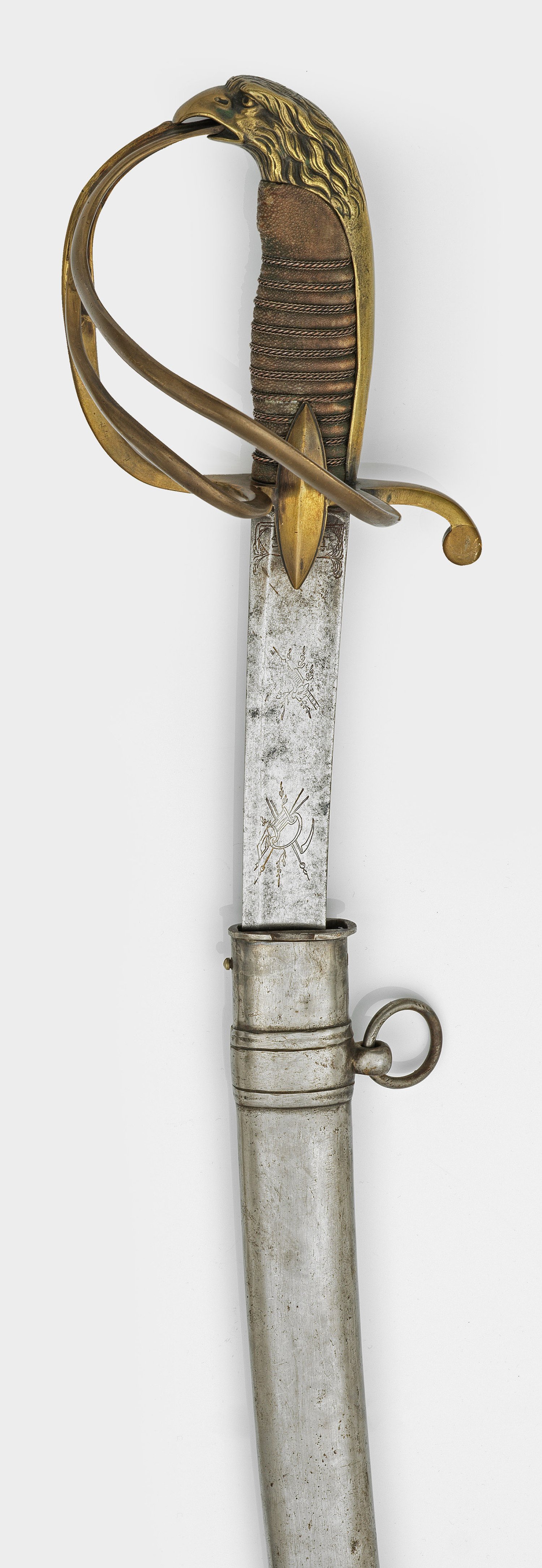Beidseitig gekehlte und geschwungene Klinge mit breiter Rückenklinge. Am Ansatz mit geätzten Triumphbündeln und Blütendarstellungen verziert. Die Fehlschärfe korrespondierend geätzt und bez. "I S & G (?)". Gefäß aus Messing mit Mitteleisen und Griffkappe in Form eines plastischen Adlerkopfes. Hilze mit Rochenhaut und gekordeltem Draht umwickelt. Säbelscheide aus Stahl mit zwei beweglichen Trageringen. L. 97,5 cm.