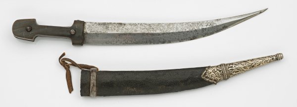 sog. Kindjal/Kindschal. Zweischneidige, gebogte und äußerst spitze Klinge, einseitig mit teilw. undeutlicher Inschrift sowie dat. "1897". Griffschalen aus dunklem, genietetem Horn. Holzscheide mit Aufhängung, einseitig mit schwarzem Leder bezogen. Mit Ortblech aus floral gestaltetem Silberblech. L. 35 cm.