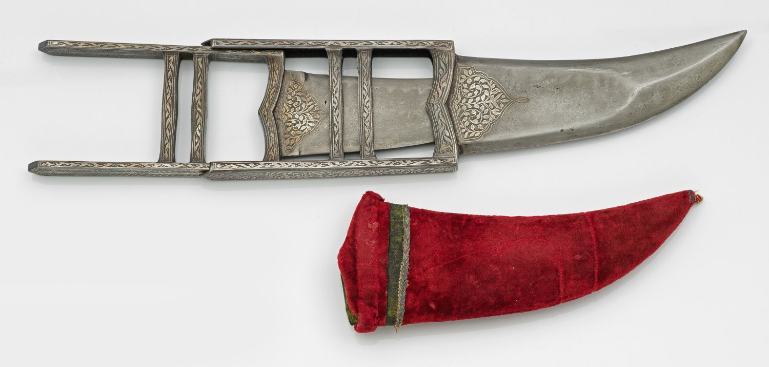 sog. Katar. Zwei gebogte, zweischneidige Damastklingen unterschiedlicher Größe. Die größere Klinge hohl gearbeitet und dient zur Aufnahme der kleineren Klinge. Jeweils mit typisch H-förmigem Eisengefäß und zwei Querstegen. Eisengefäß und Klingenansatz mit Silbereinlagen tauschiert, in Form von filigranen Blattranken. Holzscheide ummantelt mit rotem und grünem Samtstoff. L. 30 cm - 32 cm.
