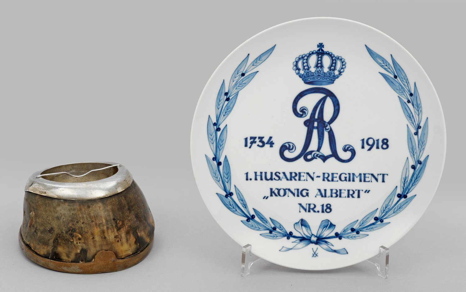 In Silber gefasster Huf des Pferdes bez. "Dicker 1914 - 1917" als Zigarrenascher. Dazu sächsischer Regimentsteller. Porzellan. Im Spiegel das von einem Lorbeerkranz gesäumte und bekrönte Augustus-Rex-Monogramm, flankiert von den Jahreszahlen 1734 und 1918, bez. Inschrift "1. Husaren-Regiment "König Albert" Nr. 18." Unterglasurblaue Malerei. Gest. 800, Tremolierstrich, Beschauzeichen. Huf besch.; Schwertermarke. D. 25,5 cm