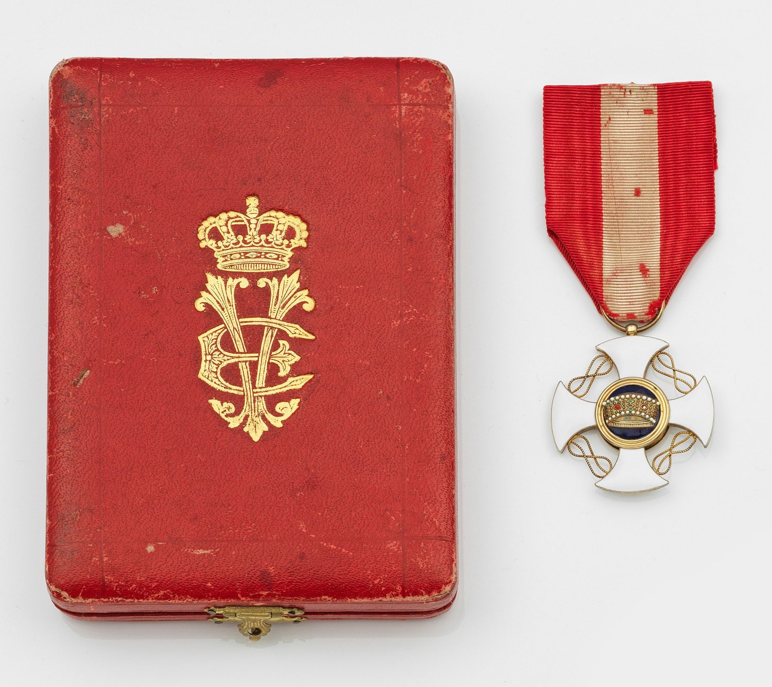 Silber, vergoldet, teilw. farbig emailliert. Weiß emailliertes, goldbordiertes Ruppertkreuz und vergoldete Liebesseile, umgeben schauseitig das golden umzogene, dunkelblau emaillierte Zentralmedaillon mit der Eisernen Krone der Lombardei und rückseitig einen gekrönten schwarzen Adler mit dem Hauswappen des Hauses Savoyen vor goldenem Grund. Rot-weiß-rotes Dreiecksband. Etui mit Herstellerzeichen. D. 3,5 cm.