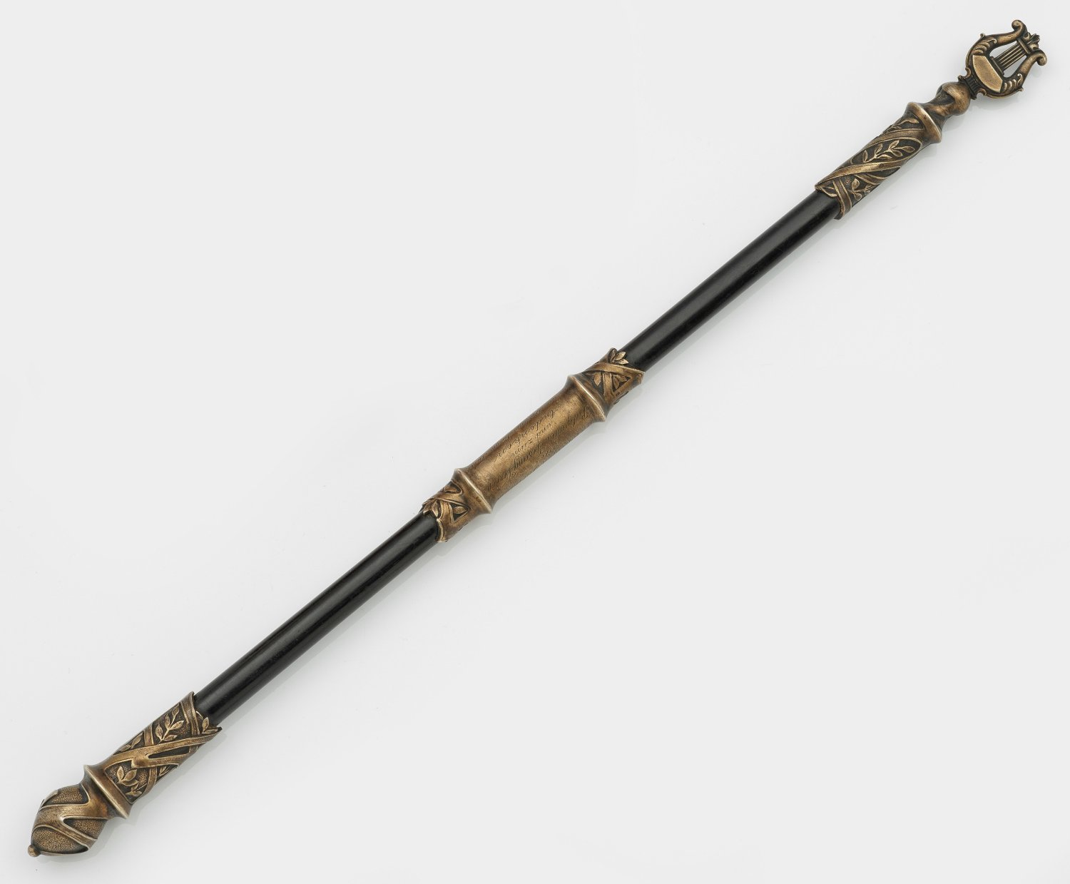 Ebonisiertes Holz, Silber. Minim. konischer, glatter Holzstab mit Silbermontierungen mittig und an den Enden. Spitze und Griff jeweils von Blättern und breiten Linien ornamentiert und abgeschlossen von plastisch ausgearbeiteter Leier bzw. zitronenförmigem Endknauf. Mittelmontierung zwischen weiteren Blattornamenten und abgrenzenden Profilringen glatt mit Inschrift "Zum 50jäjrigen Jubiläum des Belgrader Gesangs-Vereins und zum Andenken an die Berliner Sänger-Fahrt gewidmet von Siegfried Karo 1853 - 1903". Silber gest. 800, Beschauzeichen. L. 36 cm.