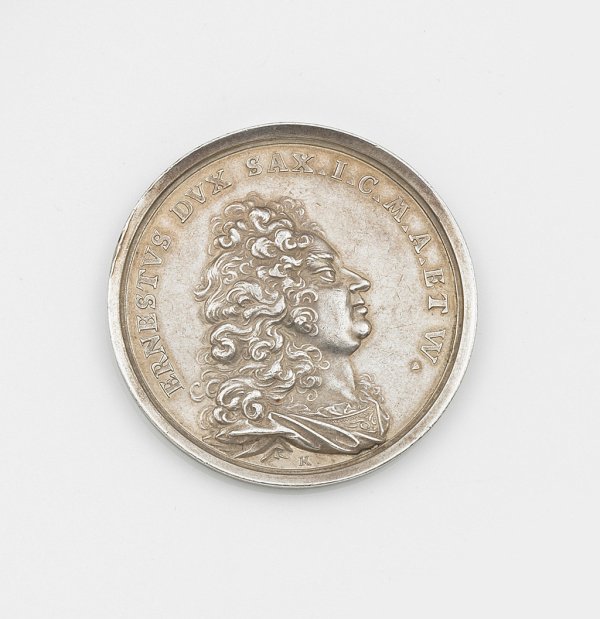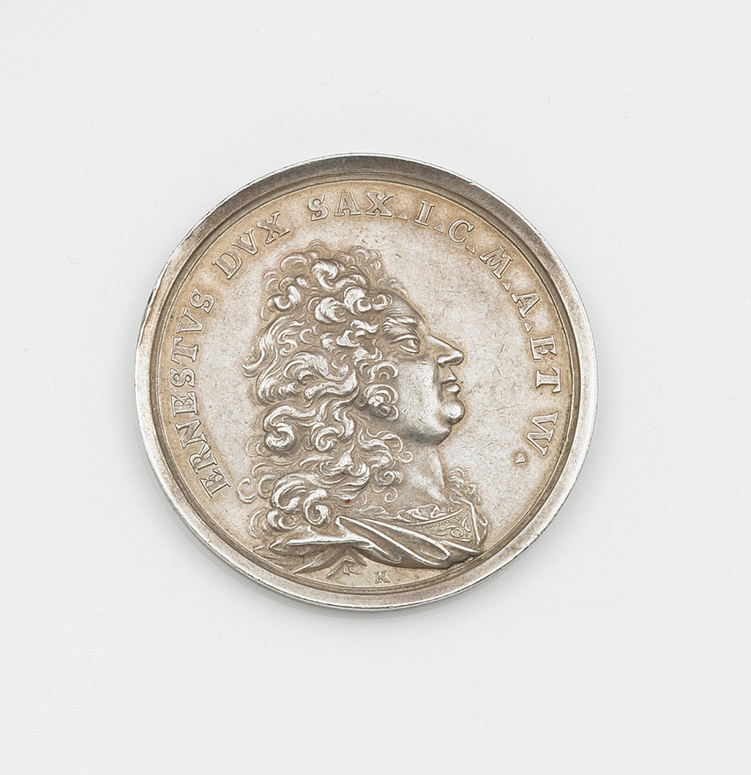 Silber. Auf einer Seite die Inschrift "Ernestus Dux Sax. I. C. M. A. Et W." und das Profil des zugehörigen Herzogs, Ernst von Sachsen-Hildburghausen (1655 - 1715); auf der anderen Seite die Inschrift "Ad me-liora" sowie "Nat. XII.IVL.MDCLV. Obiit D.XVII.Oct.MDCCXV." sowie ein Vogel, der einer Krone zwischen Wolken entgegenfliegt, während unter ihm auf einem Altar eine andere Krone und ein Schwert liegen. Gew. ca. 43 g. D. 4,8 cm.