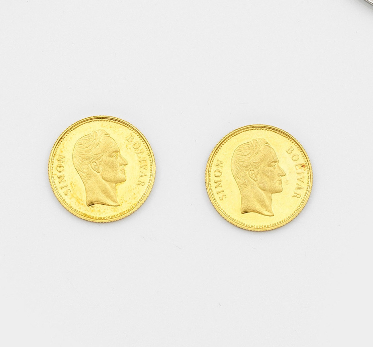 Gold. Auf einer Seite die Inschrift "Simon Bolivar" und das Profil des zugehörigen südamerikanischen Unabhängigkeitskämpfers und Diktators (1783 - 1830), auf der anderen Seite die Inschrift "Venezuela Libre Dios Lo Quiso" (dt. "Freies Venezuela, Gott wollte es") sowie die Datierung 1975, die Karte Venezuelas und einen Ölbohrturm rahmend. Gest. 900. Gew. zus. ca. 6,18 g. D. 2 cm.