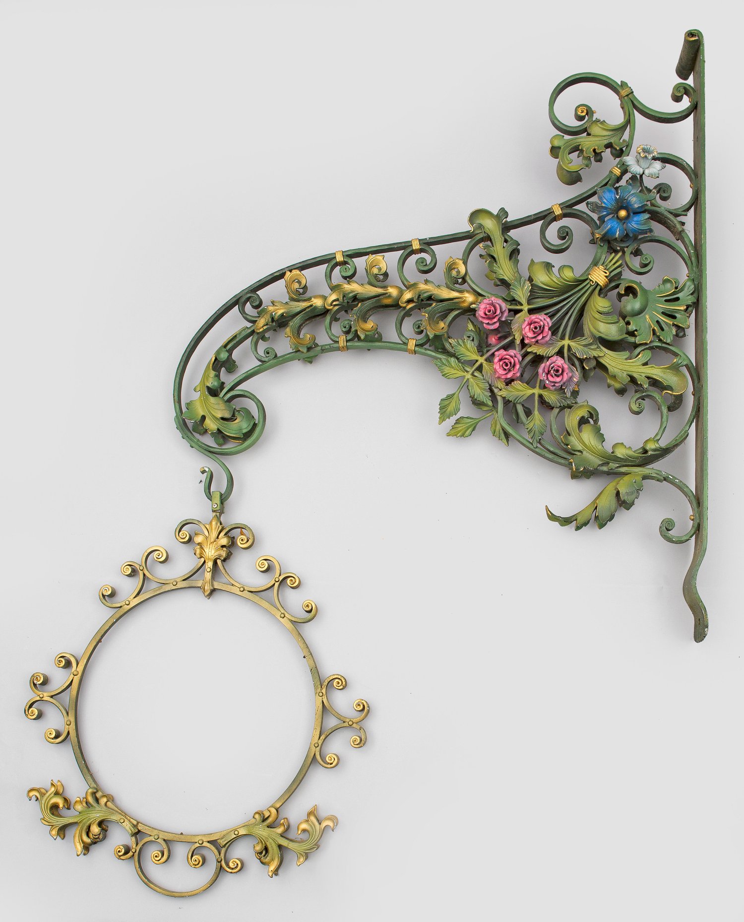 Schmiedeeisen, grün lackiert sowie blau, rosé- und goldfarben akzentuiert. Flaches Wandschild. Davon ausgehend stark geschwungener Ausleger aus üppigen, eingerollten Voluten sowie Blattwerk und unterschiedlichen, naturalistisch gestalteten Blüten als Träger für medaillonförmige Reserve. H. ca. 180 cm.