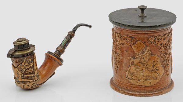 Steinzeug mit kölschbrauner Salzglasur und Zinndeckel. Holz mit Messingmontierung und Perlmutteinlage. Topf mit leicht ausgestelltem Stand und zylindrischem Korpus umlaufend mit einem rauchenden, einem trinkendem und einem geldbeutelhaltendem Mann sowie Weinranken und Vögeln verziert. Der Deckel flach mit mittig eingezogenem Knauf und innenseitig montierter Holzplatte. Die Pfeife mit Deckel aus Messing, Mundstück mit teilw. mit umlaufenden Perlmuttplatten; Pfeifenkopf mit Schnitzerei eines laufenden Wolfes in Landschaft mit Stadttor; dat. "1795". Tabaktopf H. 16 cm, Pfeife L. 21 cm.