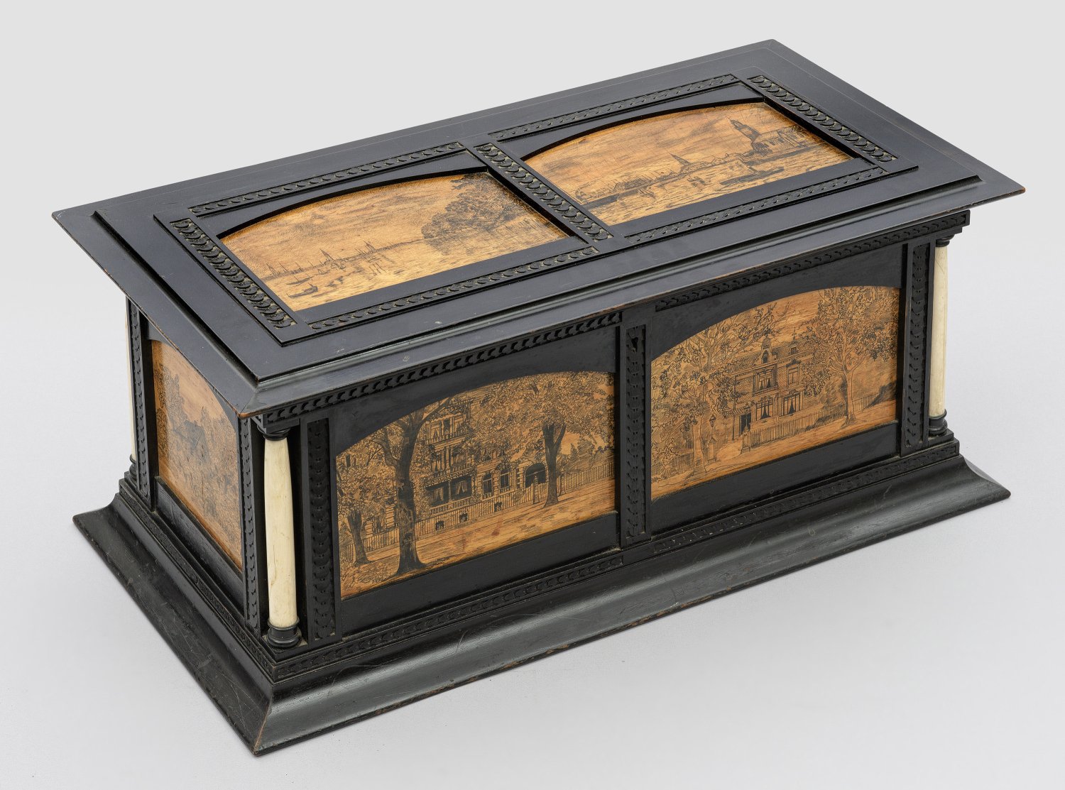 Holz, ebonisiert sowie große Reserven mit sog. Schwarzlotmalerei. Elfenbein. Gerader, querrechteckig angelegter Korpus auf leicht gekehltem Zargensockel. In den Ecken eingestellte, leicht konische Vollsäulen. Allseitig eingelassene Reserven mit unterschiedlichen Ansichten wohl der Memel sowie in der Front Villenarchitektur, begrenzt von Schuppenfriesen. Innen Samtauskleidung. H. 31 cm. 70 cm x 37 cm.