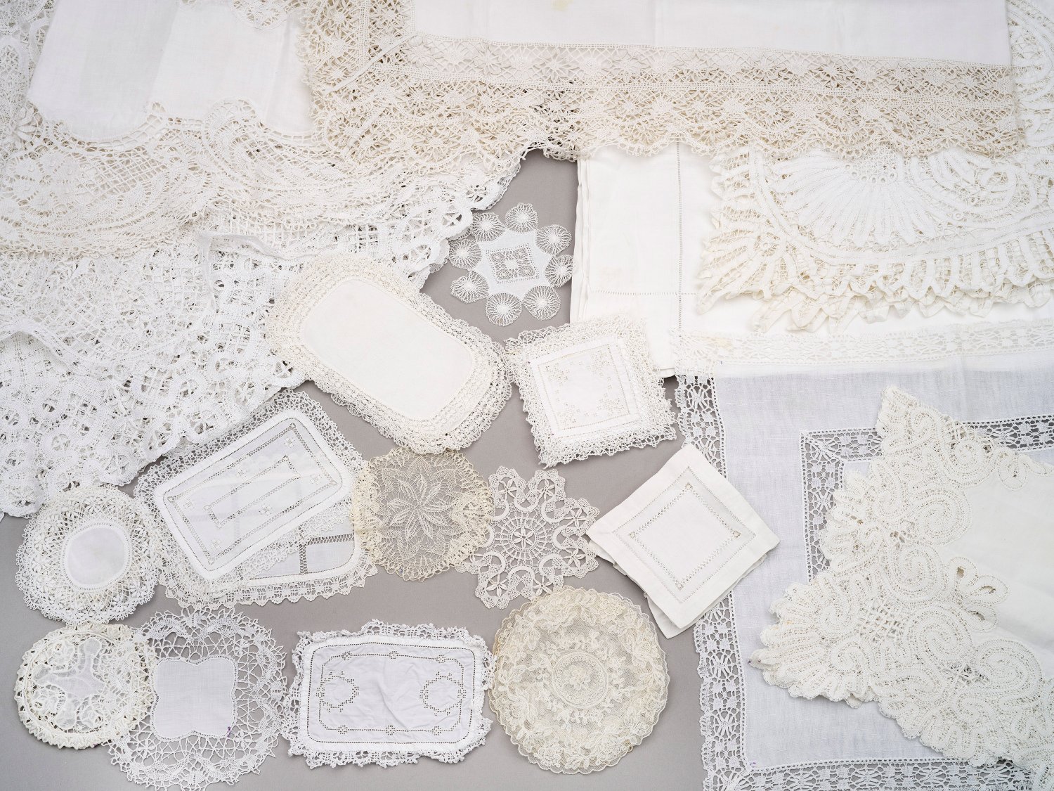 9-tlg.; Baumwolle und Leinen mit Dekoren in unterschiedlichen Ajourtechniken sowie Bordüren aus Klöppel- und Bändchenspitze, sog. Battenberg Lace bzw. Vollspitze. Zwei Tafeltücher: 200 cm x 230 cm bzw. 145 cm x 200 cm; Zwei runde Decken: D. 160 cm bzw. 110 cm; Paar Läufer: 123 cm x 50 cm; Läufer 167 cm x 55 cm; Ovale Decke: 113 cm x 55 cm. sowie kleine Mitteldecke: 70 cm x 70 cm. Dazu diverse kleine Platzdecken.