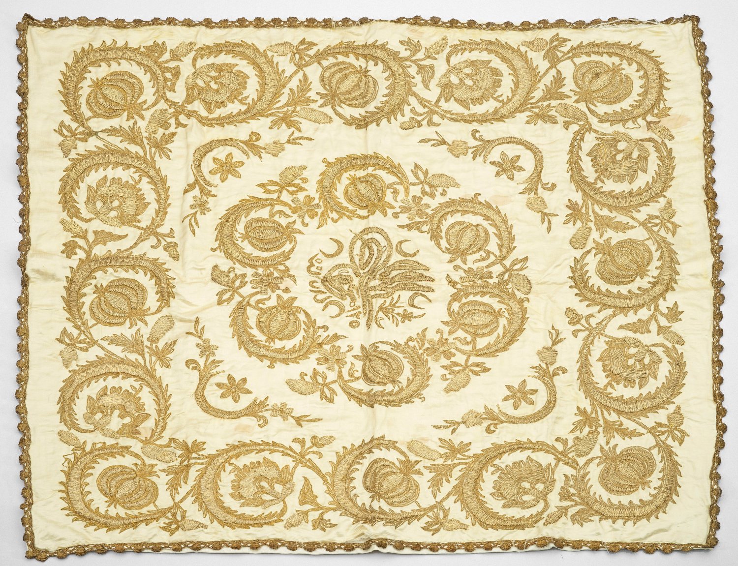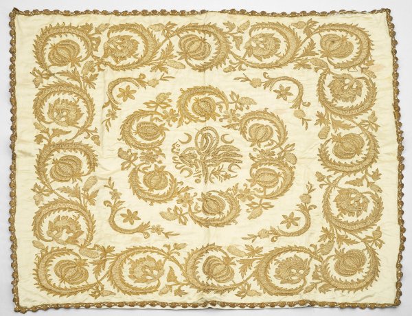 Cremefarbene Seide mit erhaben reliefierter Stickerei aus goldfarbenen Metallfäden. Rechteckiges Tuch mit zentraler Kalligraphie-Kartusche, umgeben von großen Palmettenblüten, Früchten und eingerolltem Blattwerk. Hinterlegt. 95 cm x 83 cm.