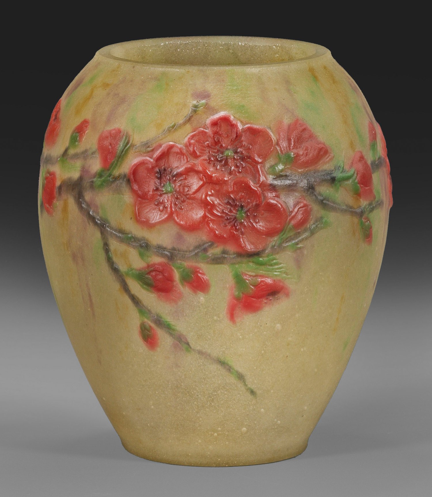 Ovoid mit weiter Mündung. Pâte-de-verre, formgeschmolzen, teilw. geschliffen und poliert. Fast opake, hellgraue bis seladongrüne Wandung, an einigen Partien zartgrün und -violett. Umlaufender, farbiger Dekor aus dunklen Pfirsichzweigen mit hellroten Blüten und grünen Blättern in leichtem Relief. Entw. Gabriel Argy-Rousseau, 1920. Sign. "G. ARGY ROUSSEAU", am Boden Nr. 6810. H. 14 cm.