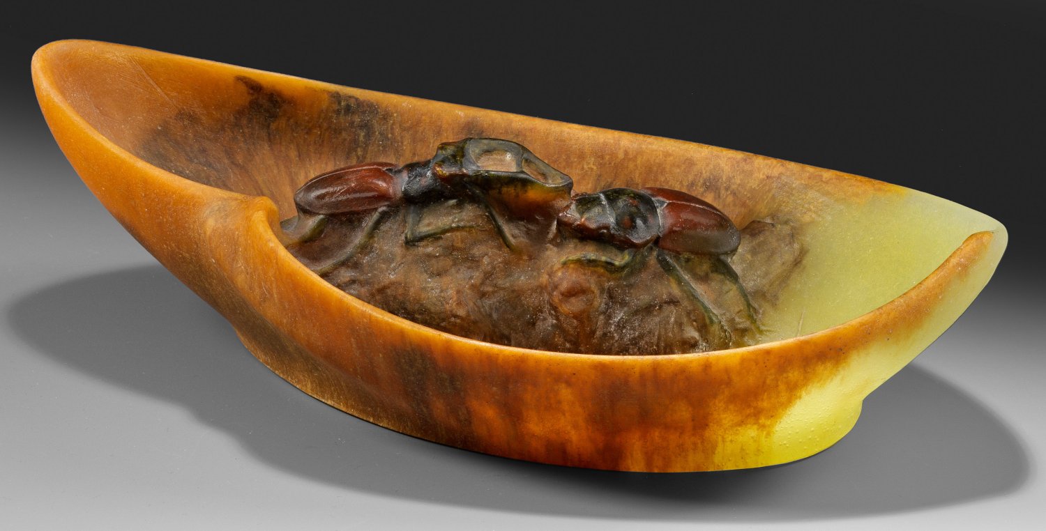 Länglich-spitzovale, blattförmige, gemuldete Schale. Pâte-de-verre, transluzide Glasmasse mit nuancierten Pulvereinschmelzungen in Gelb-. Orange-, Grün- und Brauntönen, formgeschmolzen. Innen reliefplastischer Dekor aus einem Hirschbockkäferpaar auf einer Baumwurzel. Entw.-Bez. und sign. "AWALTER NANCY". H. 7 cm; B. 27,8 cm.