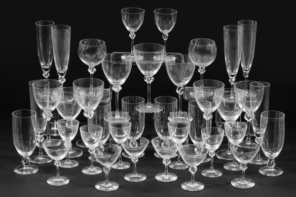 37-tlg.; 6 Sektflöten, 9 Rot-, 2 Weiß-, 2 Süd- und 6 Portweingläser, 6 Sherrygläser und 6 Biertulpen. Farbloses Glas. Schlichte, runde Form mit vierstrahlig gedrehtem Nodus am Schaftansatz. Gläser sign. "Daum France" H. 10 cm-21,5 cm.