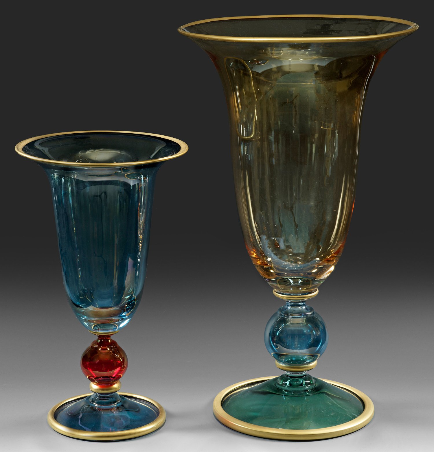 Pokalform. Auf weit ausgestelltem Fuß gegliederter Schaft mit hohlem Kugelnodus, hohe, glockenförmig ausschwingende Kuppa. Blaues, rotes und bernsteingelbes, leicht lüstrierendes Glas, goldgerändert. H. 38,5 cm-55 cm.