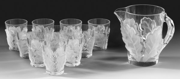 An 11-piece Lalique frosted crystal glass lemonade set with "Chene" oak leaf pattern designed by Marc Lalique in 1950 comprising pitcher and 10 glasses. Factory mark.