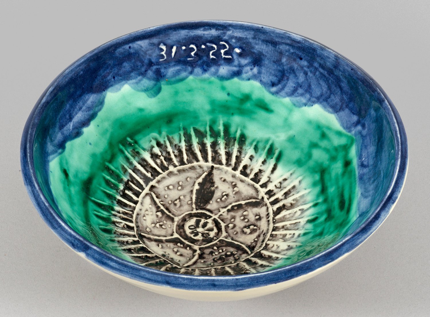 A glazed earthenware "Ousin" bowl with dark blue, green and black painted relief decor of an orchin (A. R. 268). Conceived by Picasso in 1955 and executed by the Madoura Pottery workshop in Vallauris in a numbered edition of 150. Dated "31.3.(19)55.", marked and numbered "MADOURA EMPREINTE ORIGINALE DE PICASSO", "26/150".