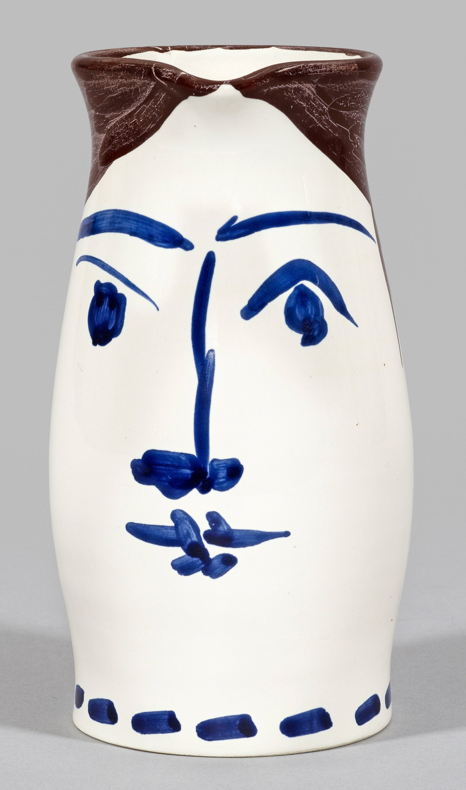 Keramik (Fayence), 1959. Schlanke, mittig leicht gebauchte Kanne mit kurzer, ausgezogener Schnaupe und dickem Ohrenhenkel. Heller, leicht cremefarbener Scherben, weiße Zinnglasur, Dekor mit stilisiertem weiblichen Gesicht in dunkelblauer und dunkelroter Malerei. Am Boden Pinselmarke mit Nummerierung "EDITION PICASSO 277/300 MADOURA, außerdem Pressmarken "EDITION PICASSO" und "MADOURA PLEIN FEU". H. 20,7 cm.