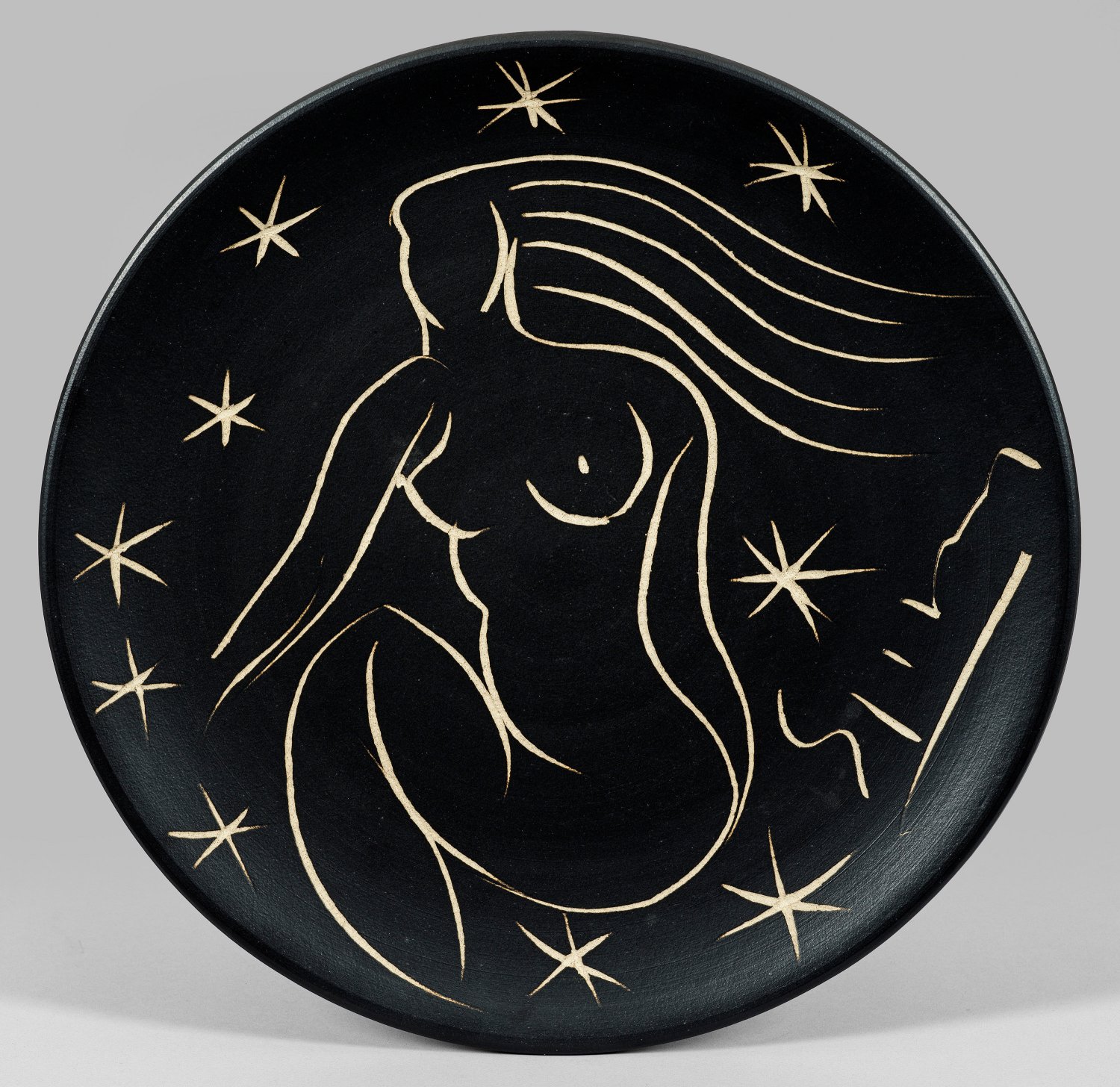 A large unique stoneware plate with black slipped and engraved decor of a female by the artist. Signed, impressed studio mark, no. 413.