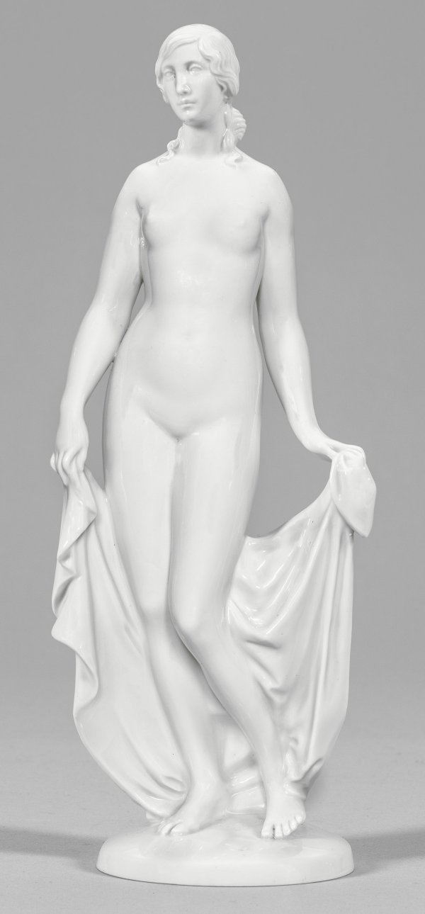 Weißporzellan. Auf einem Ovalsockel stehender weiblicher Akt mit beiden Händen ein Tuch hinter sich haltend. Entw. Richard Förster, 1938. Entw.-Bez.; Modell-Nr. 73. Gepägte Manufkaturmarke. H. 29 cm.