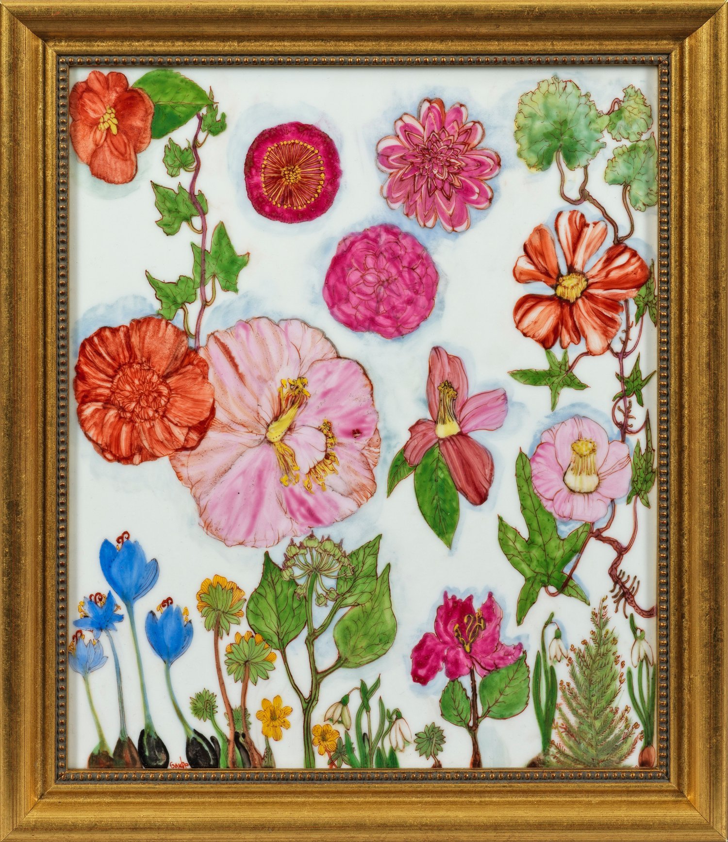 Hochrechteckige Form. Im Spiegel eine blühende Gartenlandschaft mit Kamelien. Polychrome Malerei. Vergoldete Künstler-Sign.; Holzrahmen. 27 cm x 22,5 cm (Lichtmaß). 32,5 cm x 27,5 cm (Rahmen).